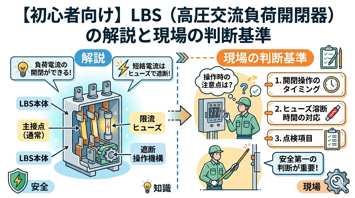 高圧受電設備の主遮断装置として、CB(遮断器)と並び最も目にする機会が多いのがLBS(高圧交流負荷開閉器)です。